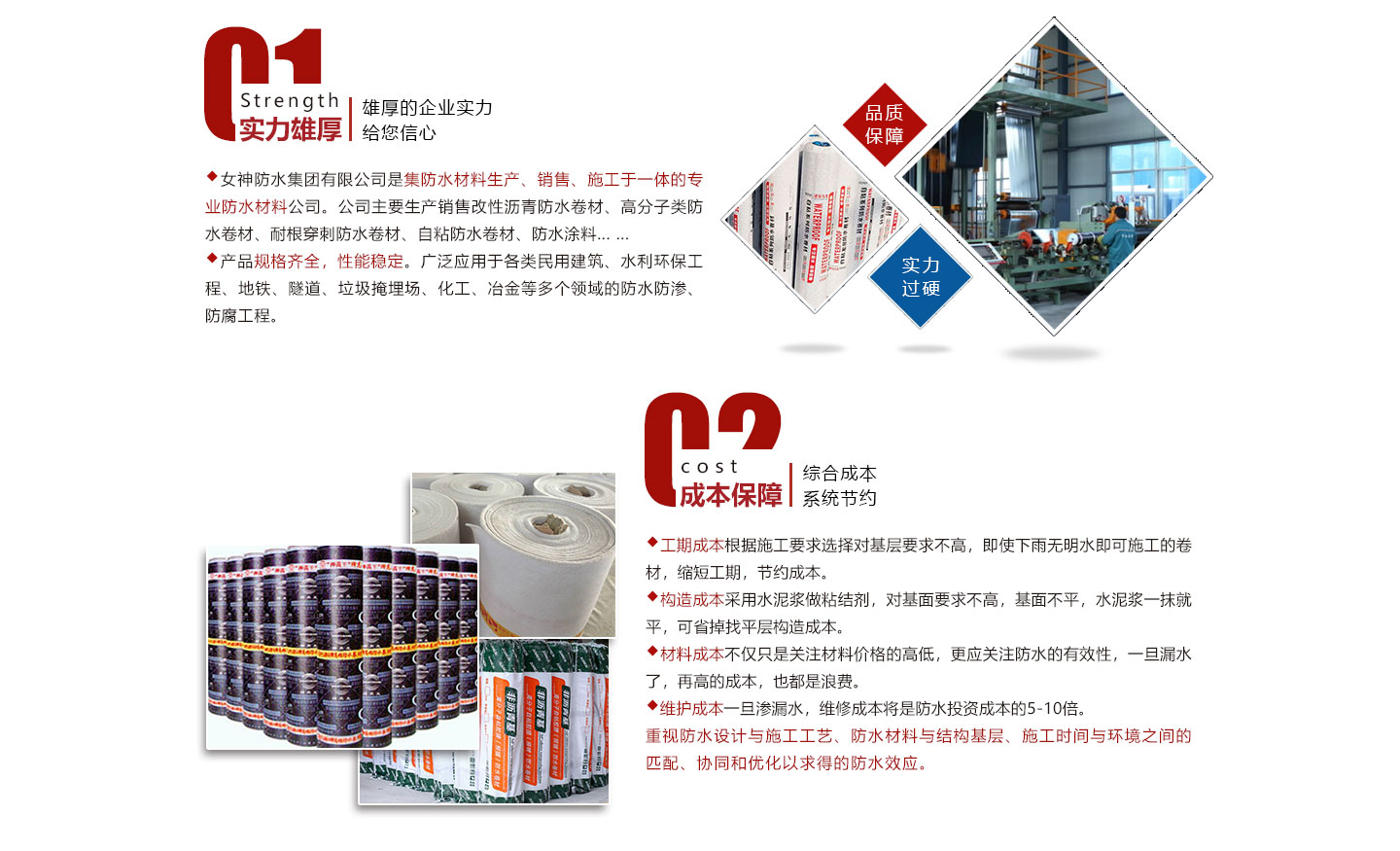 安徽女神建材科技集團有限公司是集防水材料研發(fā)、生產(chǎn)、銷售、施工為一體的綜合性防水材料集團公司。我公司旗下有多條大型一次成型生產(chǎn)線:SBS改性瀝青防水卷材,DTM聚酯復(fù)合高分子防水卷材,非瀝青基高分子防水卷材,PVC,TPO高分子防水卷材等生產(chǎn)線。我公司秉承“創(chuàng)新發(fā)展、實惠用戶”為宗旨,確保生產(chǎn)材料基礎(chǔ)上推出“共享生產(chǎn)廠家”,為開發(fā)商、建筑商節(jié)約成本為理念,新理念受到用戶企業(yè)集采時一致好評和認(rèn)可。在互聯(lián)網(wǎng)時代,我公司將以互聯(lián)網(wǎng)“共享”為發(fā)展理念,為開發(fā)商、建筑商、防水企業(yè)提供的產(chǎn)品,真正讓用戶企業(yè)達(dá)到巨大...